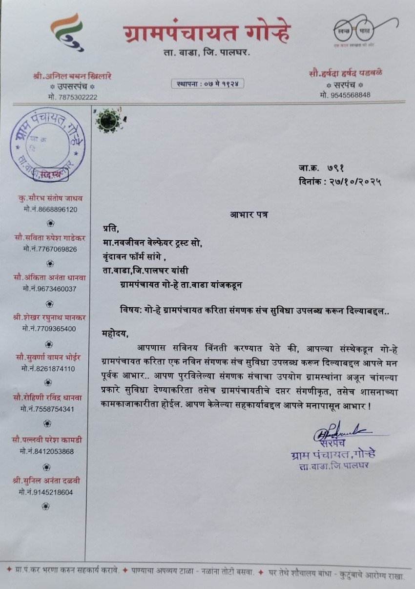 The grampanchayat Sarpanch of Village Gorhe, Palghar had requested our trust for a Latest computer to keep all records related to Gorhe Village and villagers staying in Gorhe organised. And Letter of thanks given by the Sarpanch and oop Sarpanch after giving the grampanchayat office an upgraded desktop. President - Navjeevan Welfare Trust alongwith Sarpanch and oop sarpanch Gorhe Gram Panchayat Mrs Harshada Padavle and Mr Anil Khilare.